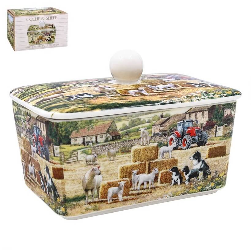 Prachtige botervloot te mooi om te gebruiken. Deze met een collie en schapen als opdruk staat zeer mooi op tafel. Heerlijk de boter in doen en dan uit deze botervloot halen met landelijke printen.