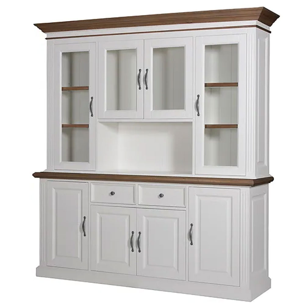 Royale landelijke buffetkast, de bovenkast is voorzien van 2 grote en 2 kleine vitrinedeuren om zo al uw servies veilig op te bergen.