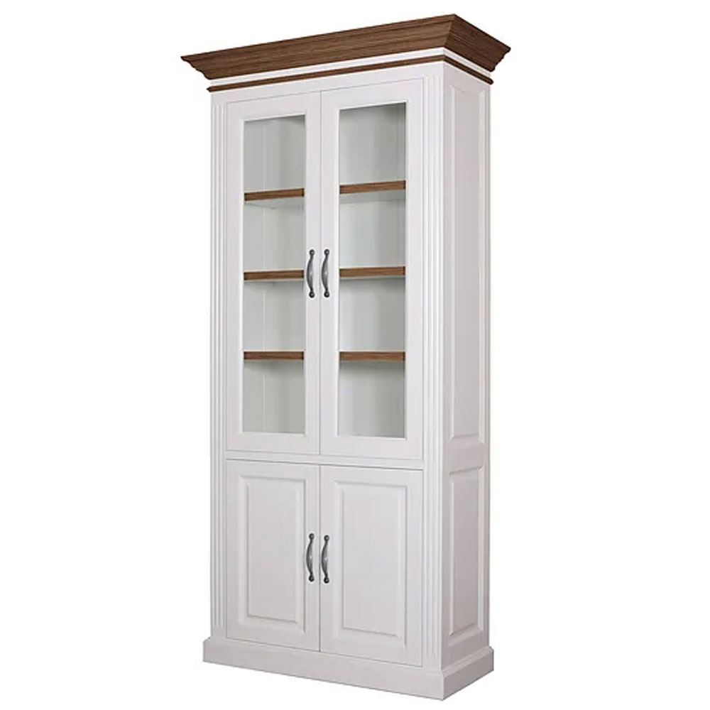 Gelijk uitgevoerd aan de boekenkast, echter heeft hier de kast 2 vitrinedeuren in het bovenste gedeelte van de kast. Door de eiken accenten krijgt de kast een stoere landelijke uitstraling.