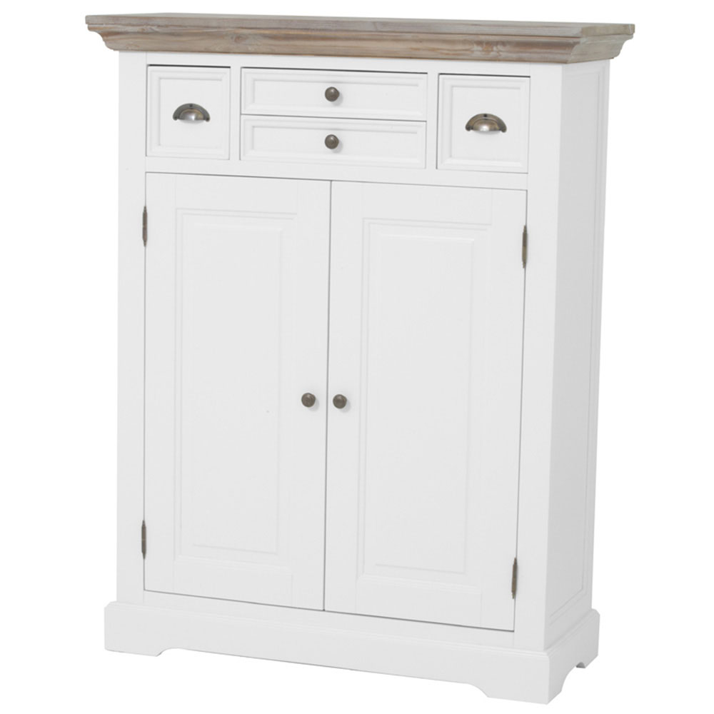 Het romantische en landelijke meubelprogramma Fleur bestaat uit diverse trendy, witte meubelen met vergrijsde houten bladen.De meidenkast is voorzien van 2 openslaande deuren en 4 opbergladen.Afmeting: 100x40x128 (h)cm Kleur: C027 White RAL 9010 – pine old greyBekijk ook de andere meubelen van het romantische programma Fleur.Levertijd: 2 – 4 weken
