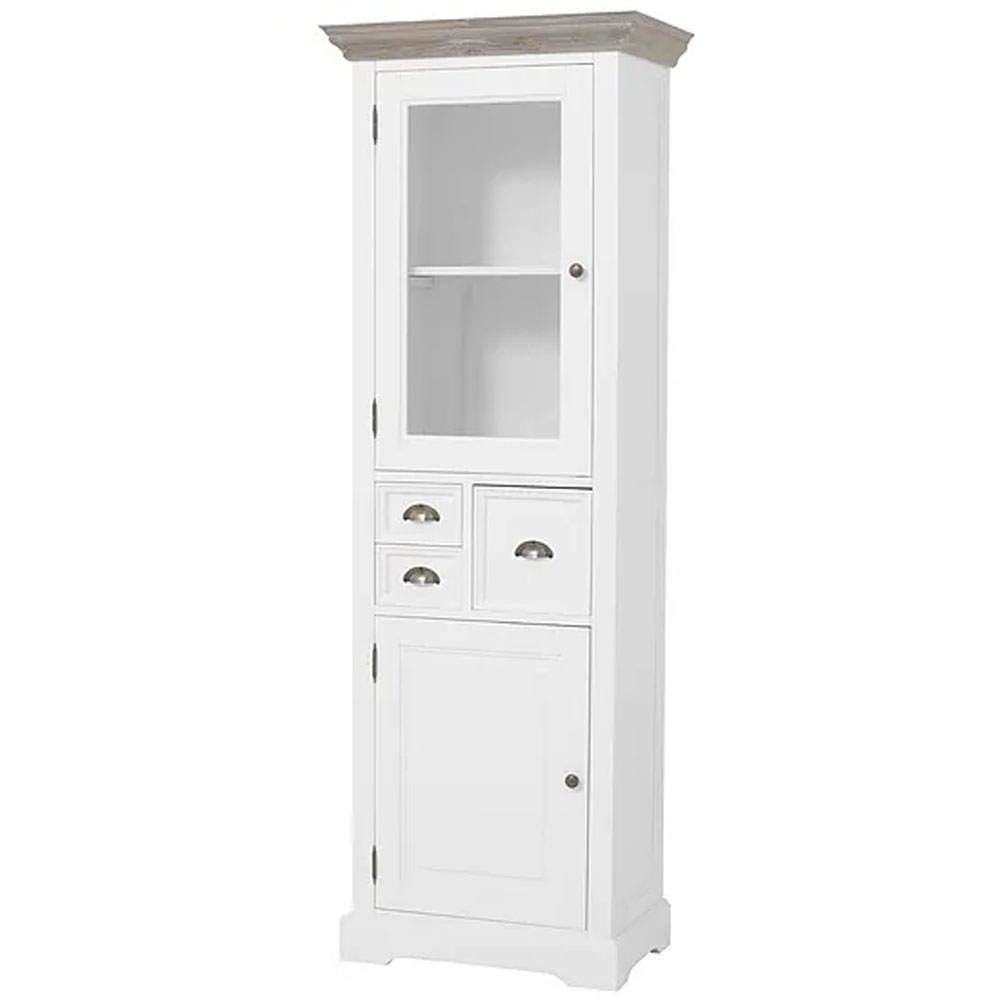 Het romantische en landelijke meubelprogramma Fleur bestaat uit diverse trendy, witte meubelen met vergrijsde houten bladen.De vitrinekast voorzien van diverse handige opbergladen en kasten.Afmeting: 66x40x191 (h)cm Kleur: C027 White RAL 9010 – pine old greyBekijk ook de andere meubelen van het romantische programma Fleur.Levertijd: 2 – 4 weken