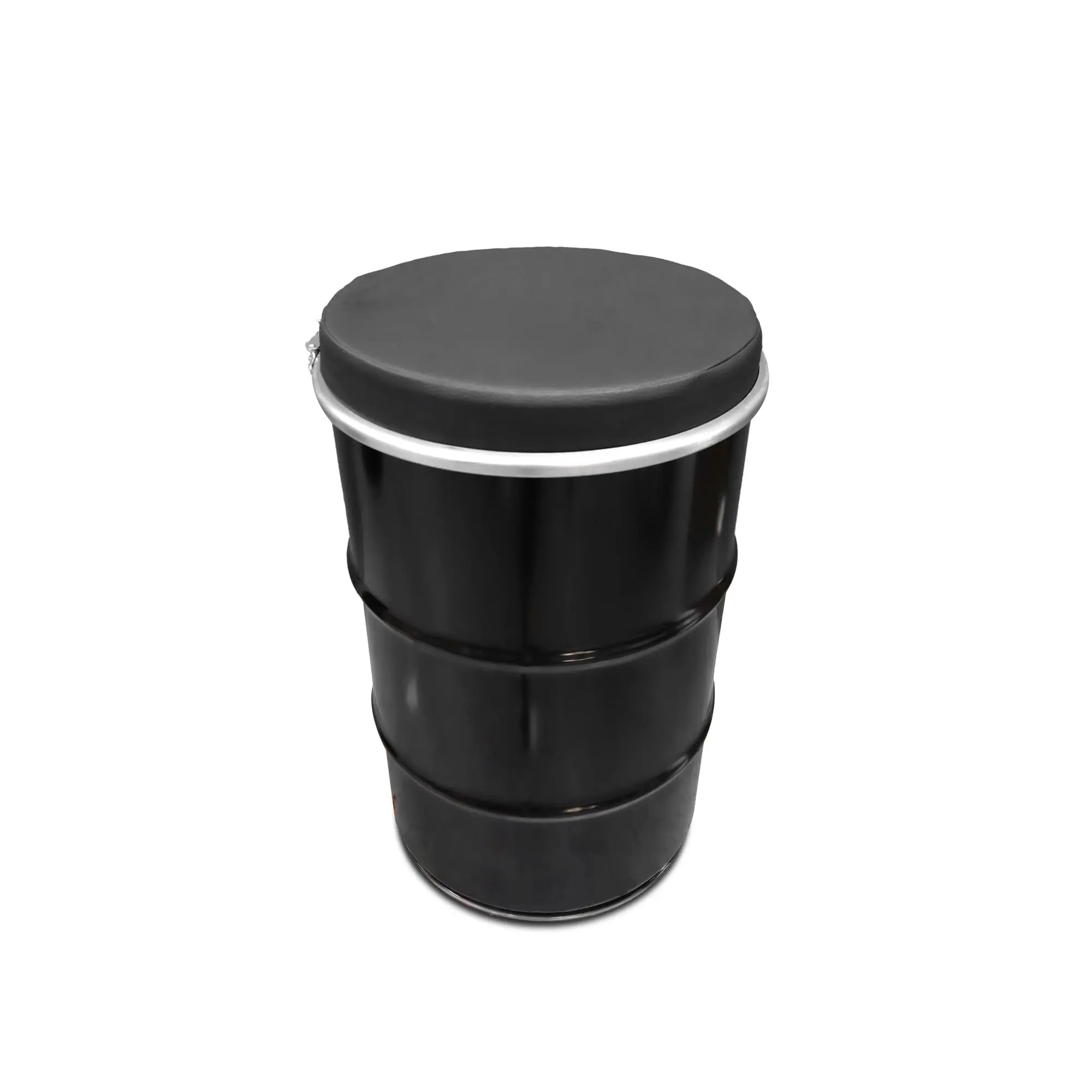 Deze veelzijdige barrel-seat kruk/krukje is van oorsprong een 60 Liter olievat- olie ton in de kleur zwart. Het kussen is lekker zacht en gemaakt van hoge kwaliteit Skai- leer. Het zitje is gemakkelijk te verplaatsen. Hij is licht en heeft een praktisch formaat. Daarnaast kan je hem handig tillen aan zijn twee stalen handvaten. Door zijn stoere industriële looks en tijdloos design is het een multifunctionele tafeltje- kruk in huis en tuin.