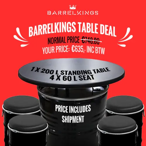 Met deze combideal bespaart u geld en zit u heerlijk zacht op de 60l olievat zitjes aan een industriële statafel.
