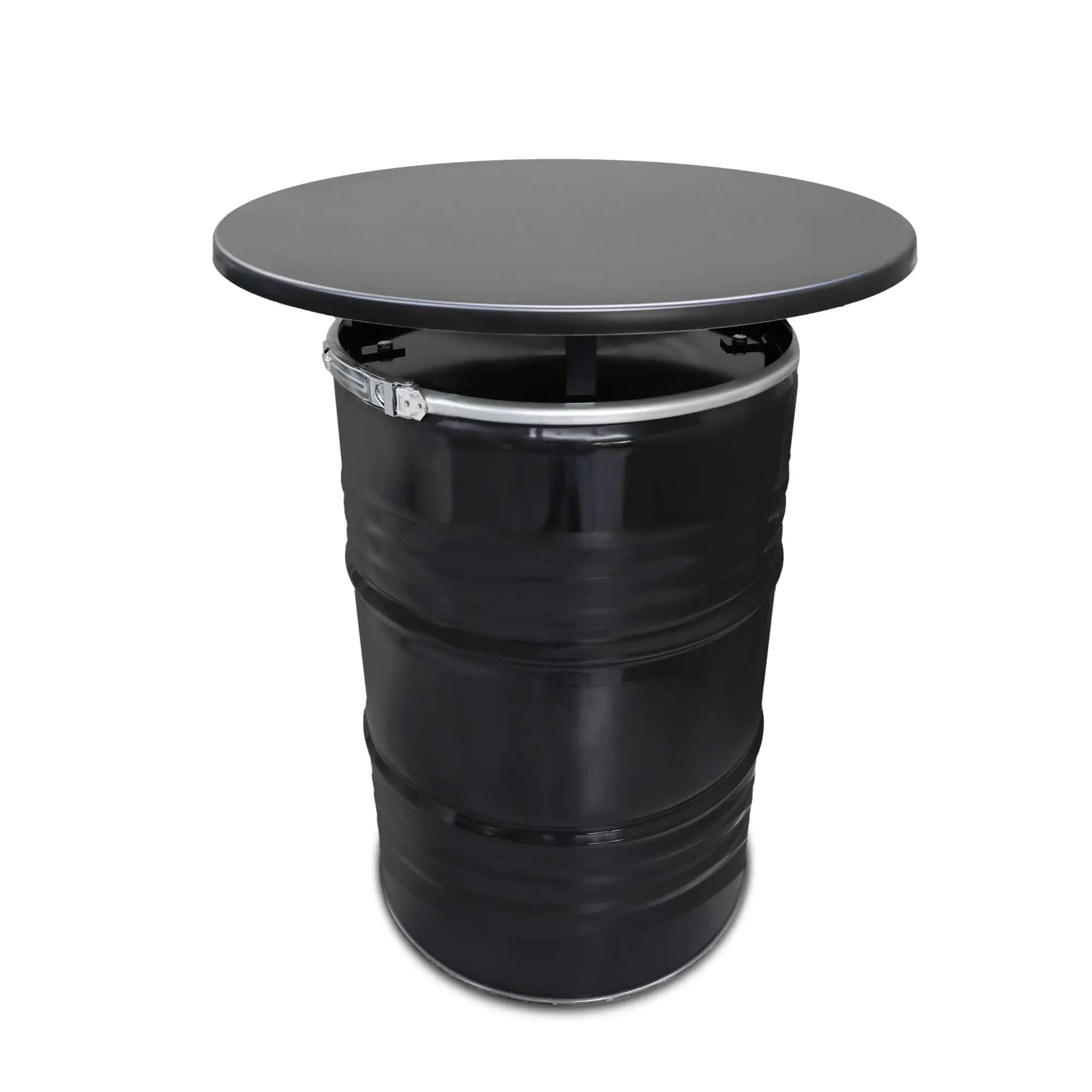 De binnenzijde van het vat is gecoat. De deksel kan met behulp van de dekselklem in paar seconden er af. Dat betekent dat de tafel verzwaard kan worden met bijvoorbeeld zandzakken. Handig als je hem buiten zet en het hard waait!. Of sla je spullen erin in op. De statafel is geschikt voor elke tuin, voor in het café, voor op het terras of voor in de winkel.