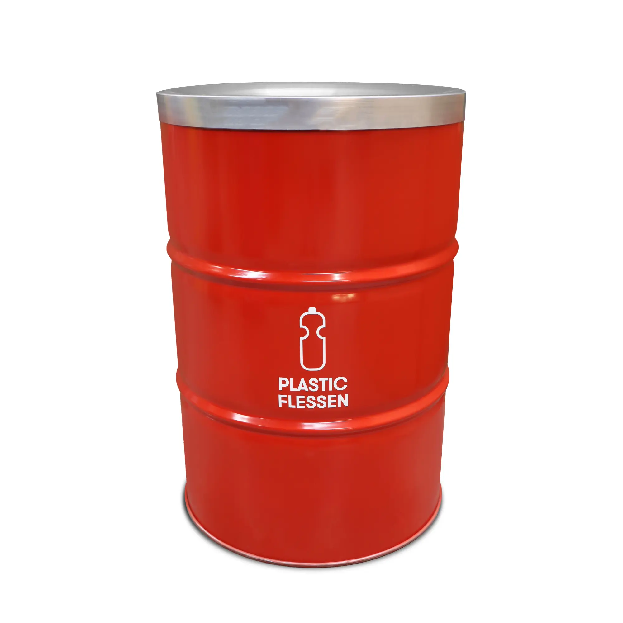 BinBin vlam rood |industriële olievat prullenbak 200 Liter met vlamwerend deksel| PET flessen inzameling| afvalscheiding