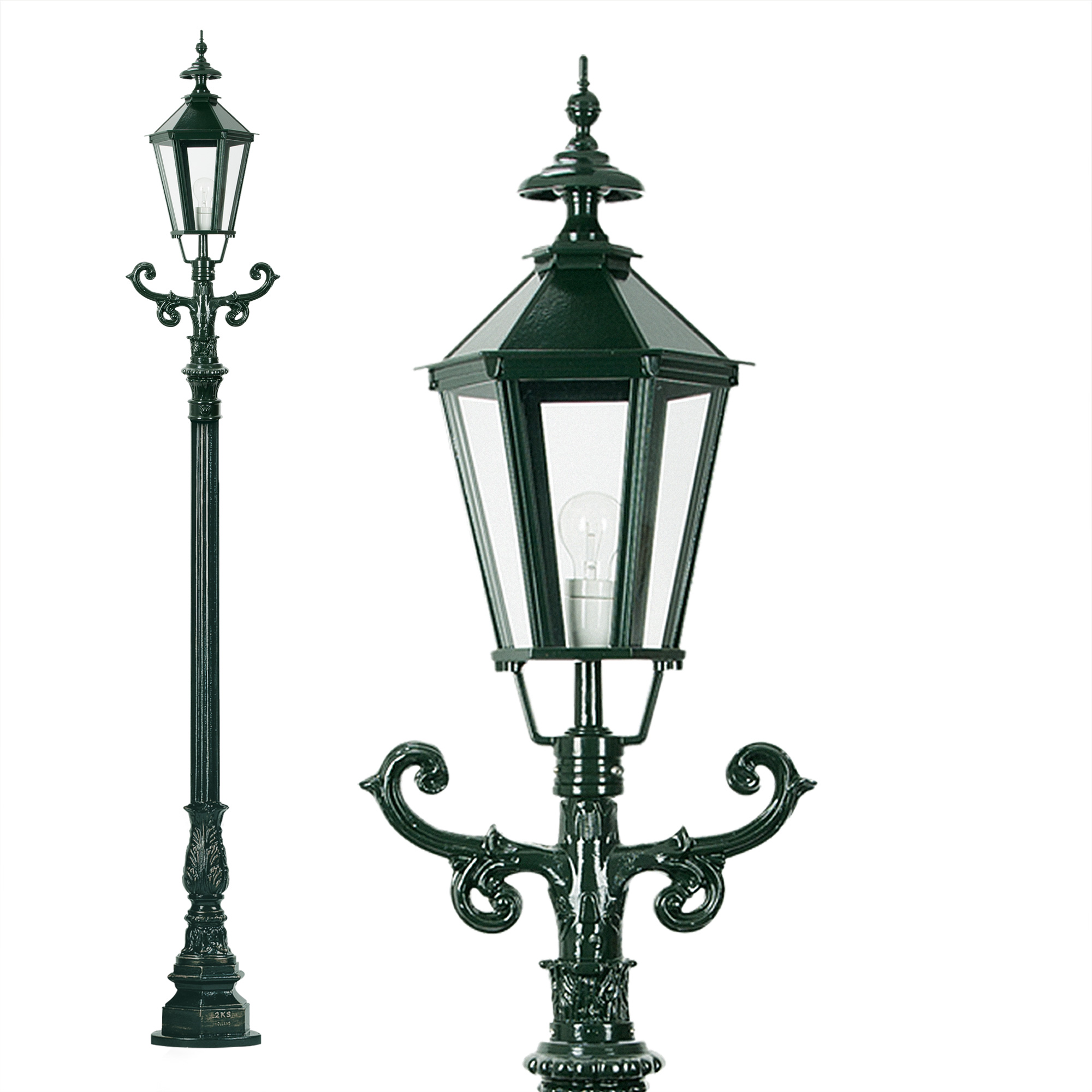 Prachtige stijlvol klassieke lantaarnpaal met laddersteun en zeskante lantaarnkap. De Siegburg is een klassiek vormgegeven straatlantaarn – tuinlantaarn. Fraaie exclusieve KS buitenlamp van hoogwaardige kwaliteit. De complete combinatie, lantaarnpaal + laddersteun + kap zijn gemaakt van aluminium en voorzien van een weerbestendige dubbellaagse poedercoating, gepantserde laklaag. De lantaarnkap van de Siegburg heeft helder glas dit geeft een optimale mooie lichtval. Door de E27 fitting zijn er diverse lichtbronnen toe te passen, ook energiezuinig en LED lampen. De Siegburg heeft een totale hoogte van 245 cm.